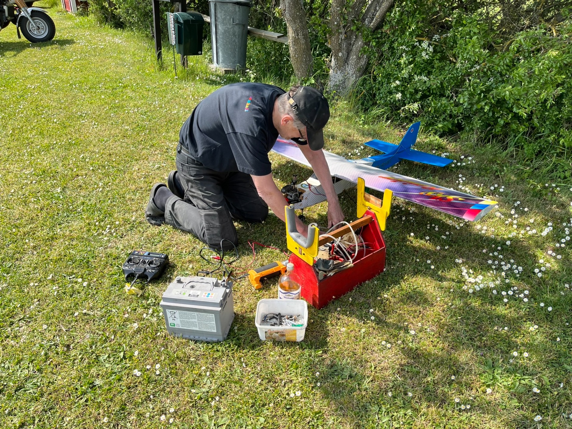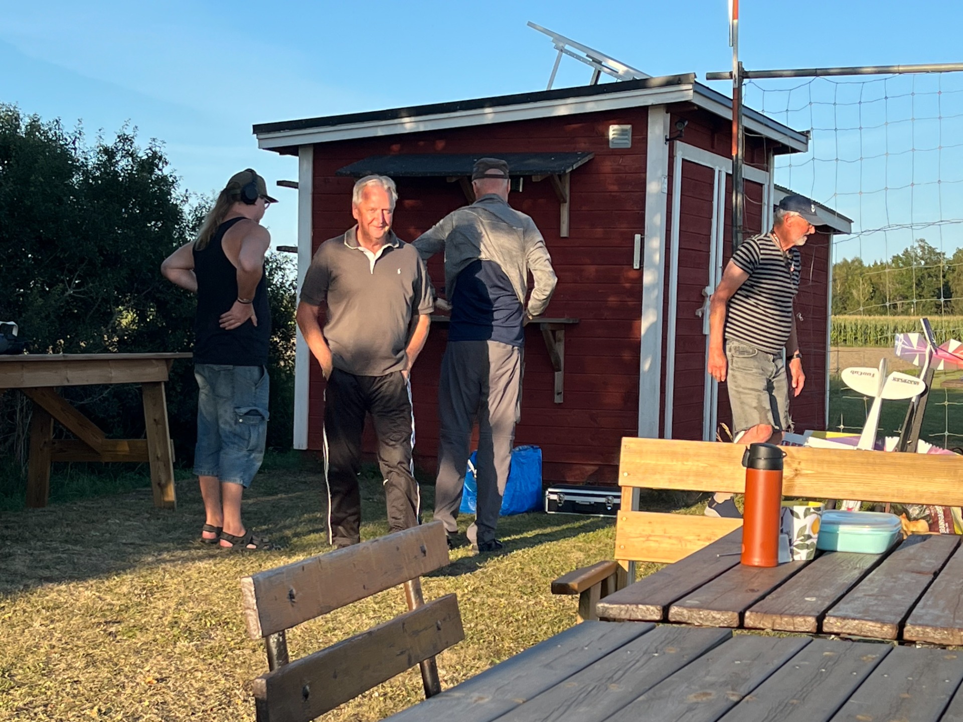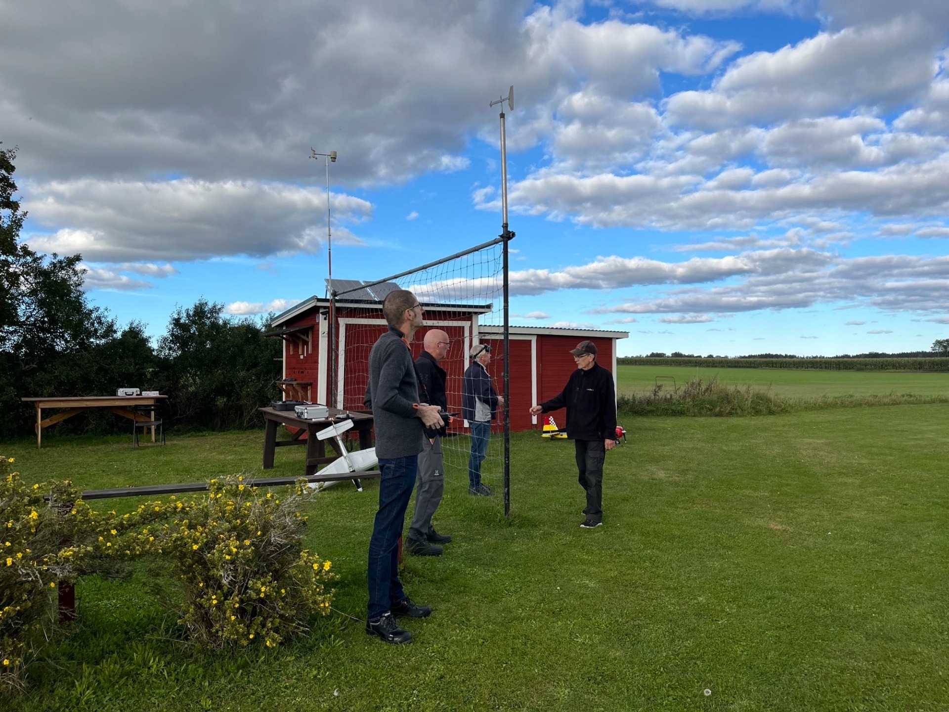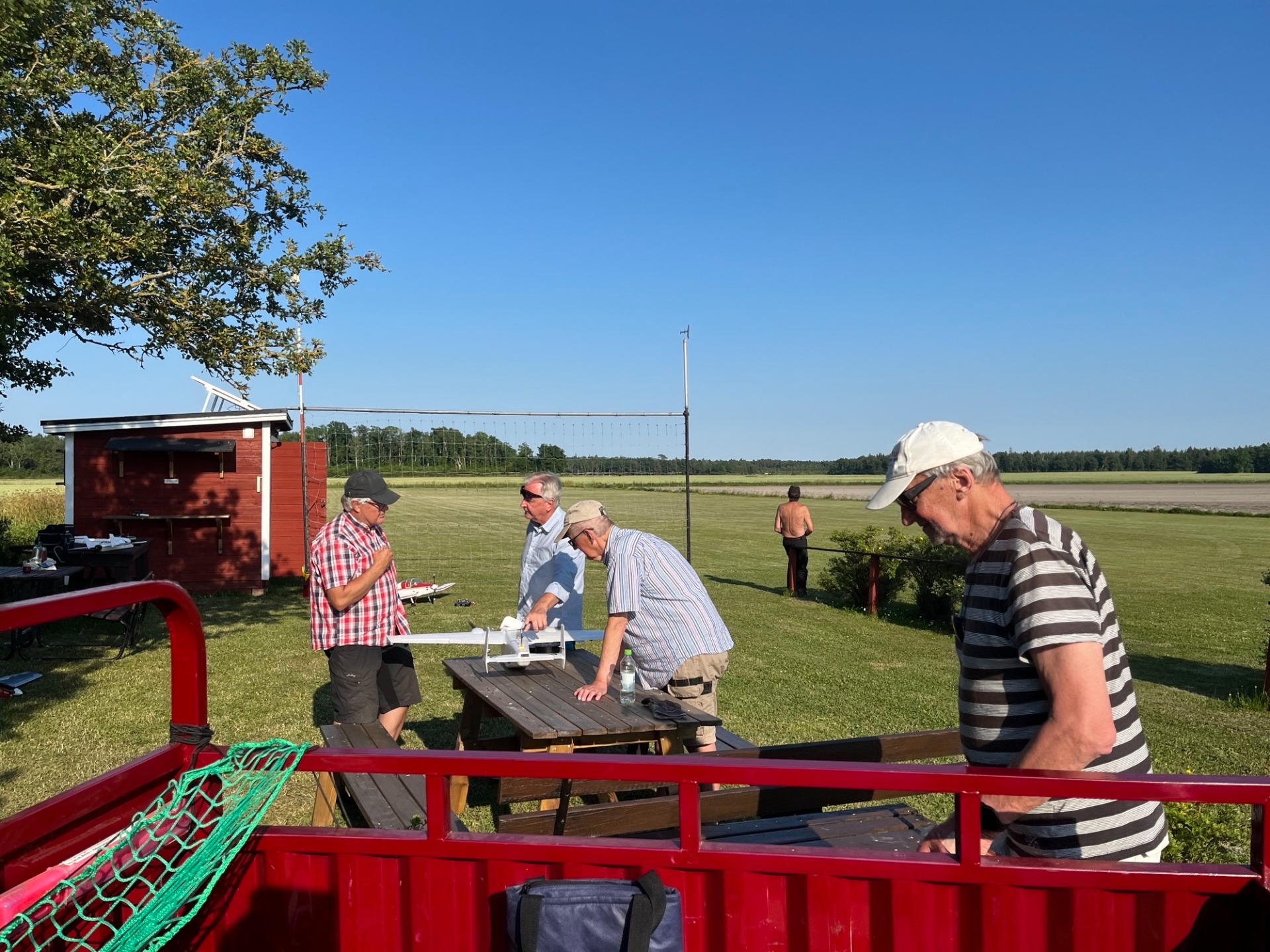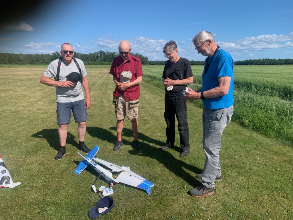 Torsdag eftermiddag den 26 juni och 7 flygare ute i det för en gångs skull fina vädret. Här diskuteras det olika sändarmoduler och hur man kan ändra sändarprotokoll på ett enkelt sätt. (Foto Bertil)