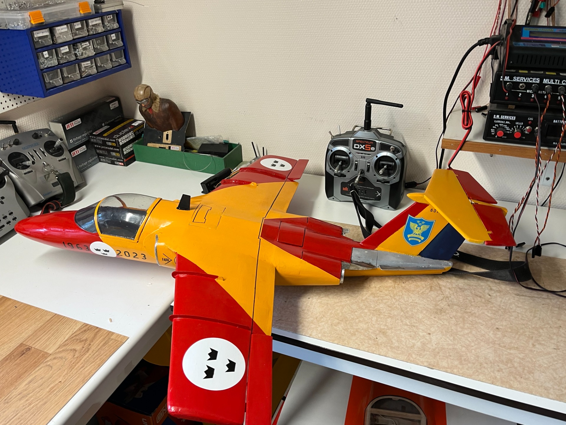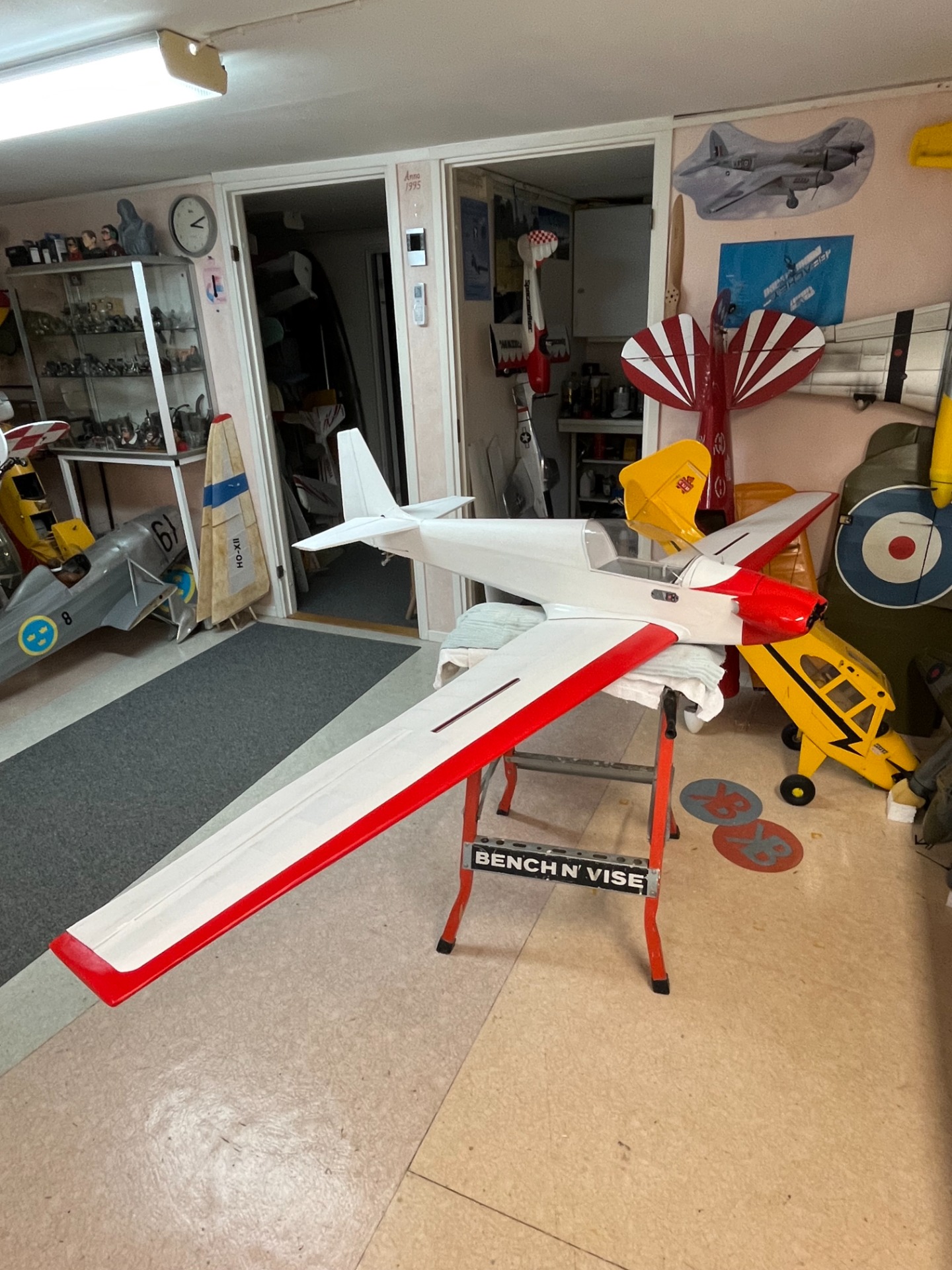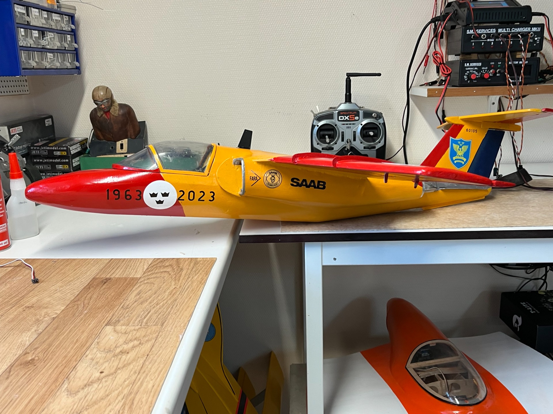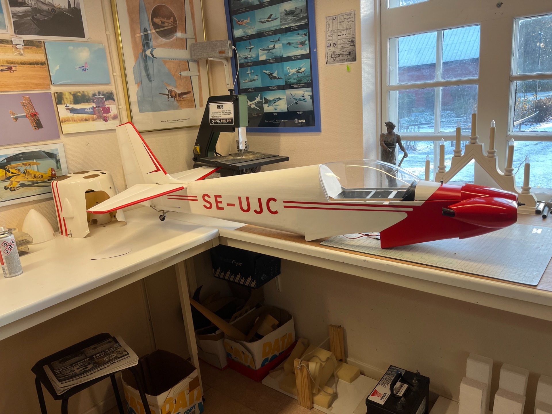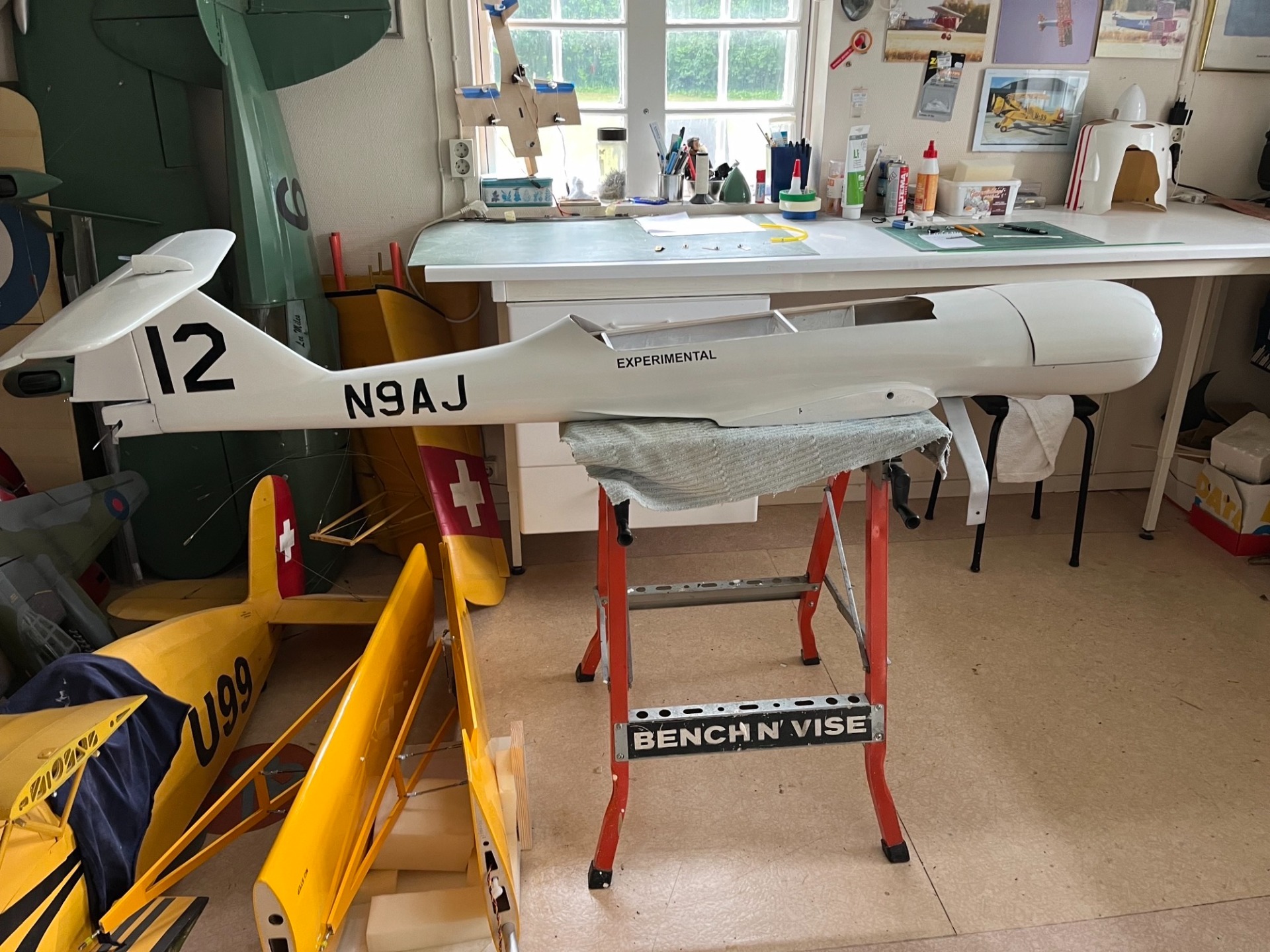 I dag den 24 november är modellen i stort sett reparerad. Ny noskåpa gjuten och huv dragen. Sargen till huven återstår att färdigställa. Jag har förbättrat konstruktionen både i kroppen och vingen. Mick Reeves konstruktion för vingen har jag slopat och använder ett kolfiberrör för att sammanfoga vinghalvorna. Ny elmotor är monterad. Ganska mycket arbete med att återuppbygga modellen men skam den som ger sig! (Foto Bertil.)