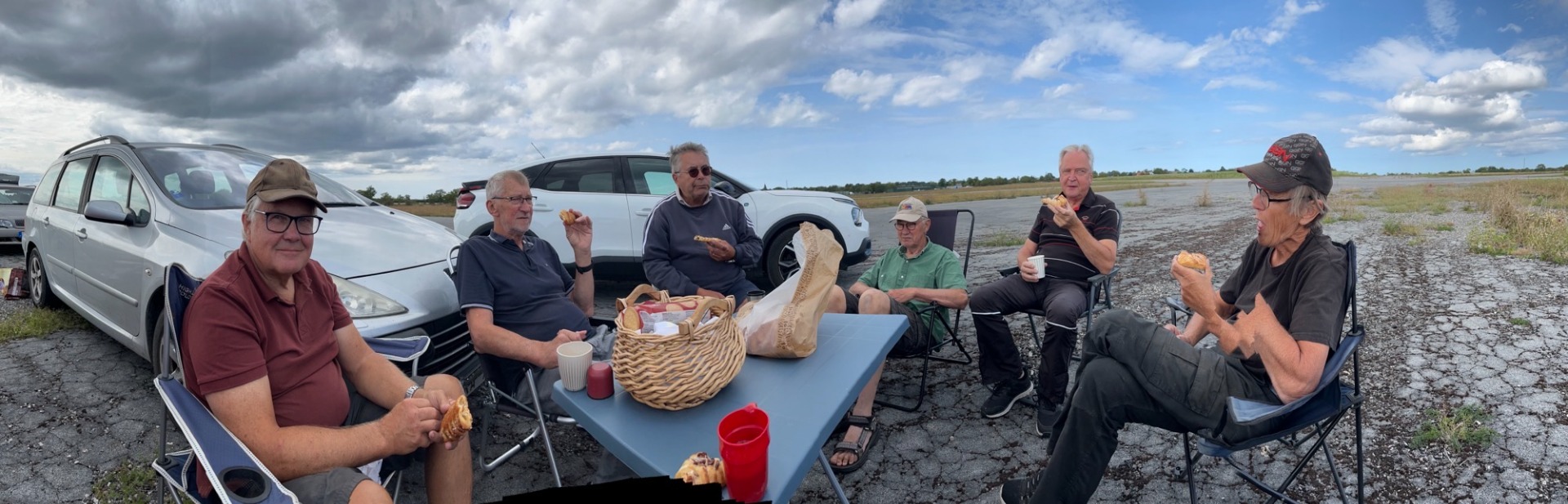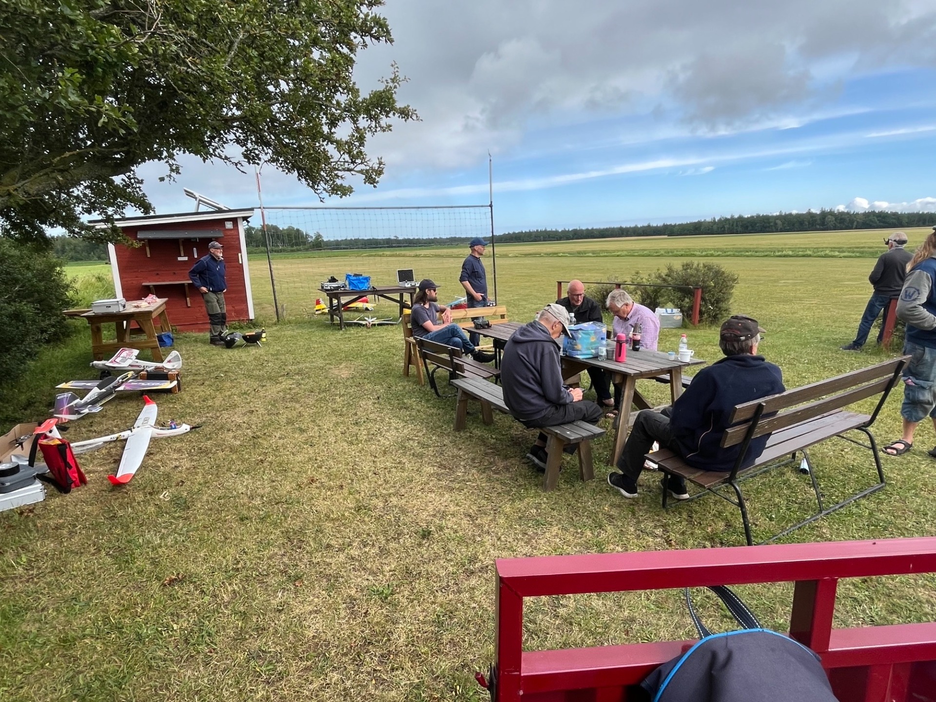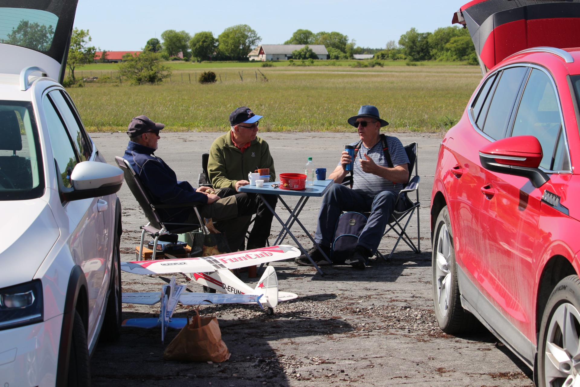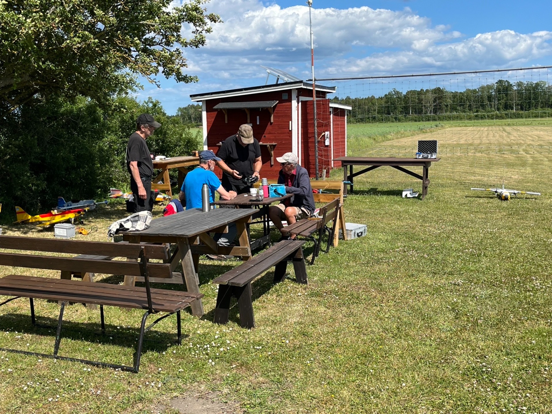 Det blev naturligtvis tid för fikapauser och modellflygsnack. Här syns några av deltagarna i träffen. (Foto Bo Lagerström)