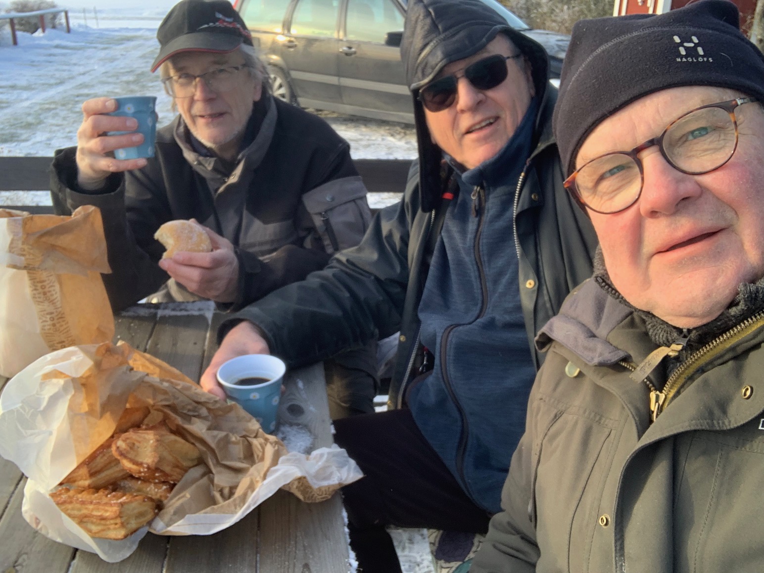 Tre tappra GHMA.are fikar i depån. Tomas hade förtjänstfullt fixat kaffe och mumsigt kaffebröd. Verkligen gott och vi fick en trevlig pratstund i det härliga vintervädret. Precis stilla och inte en enda liten vindkåre. Frostdimma över fälten och solen i ett vackert dis. Kan det bli en finare vinter dag? (foto Tomas H)