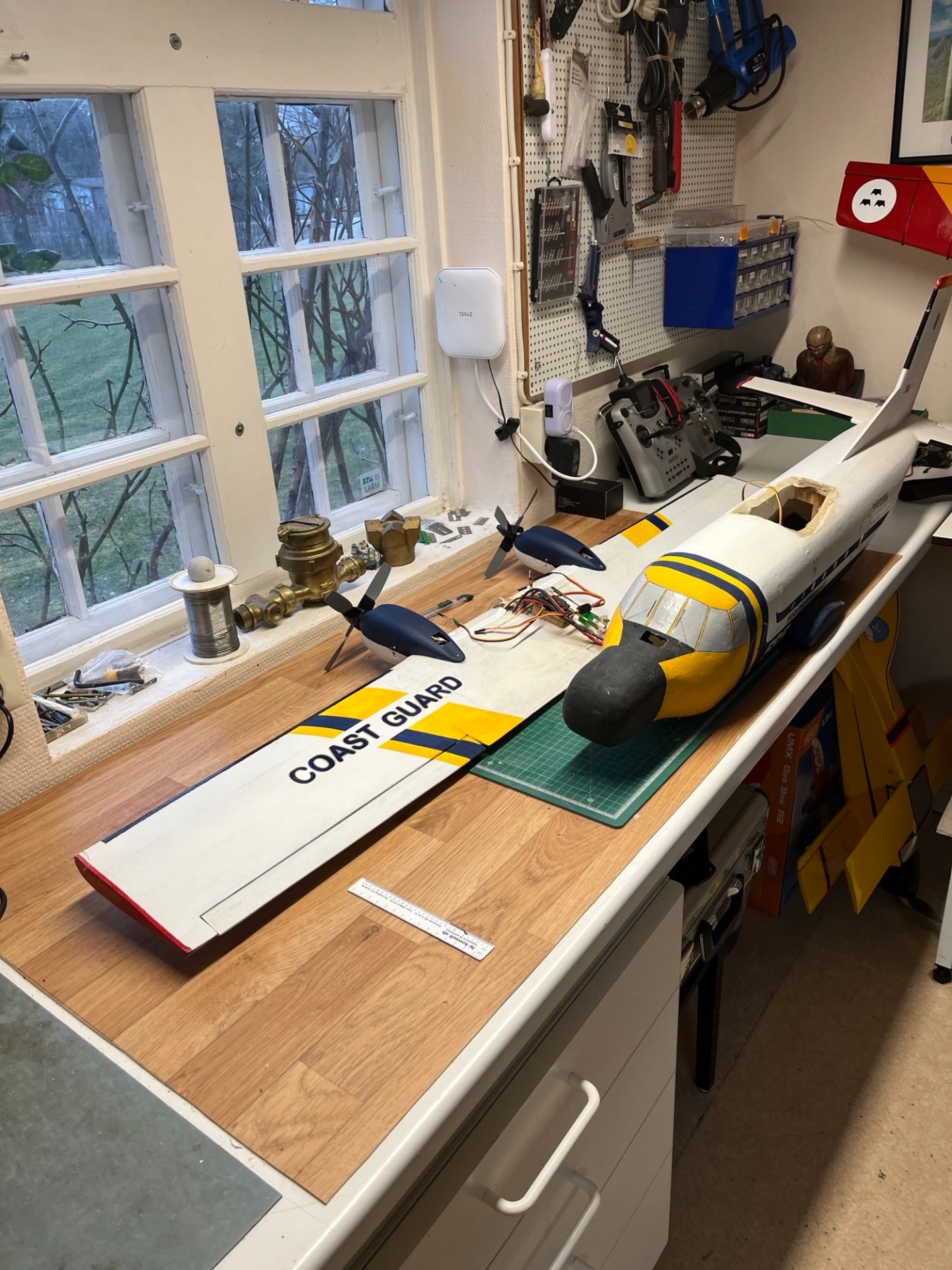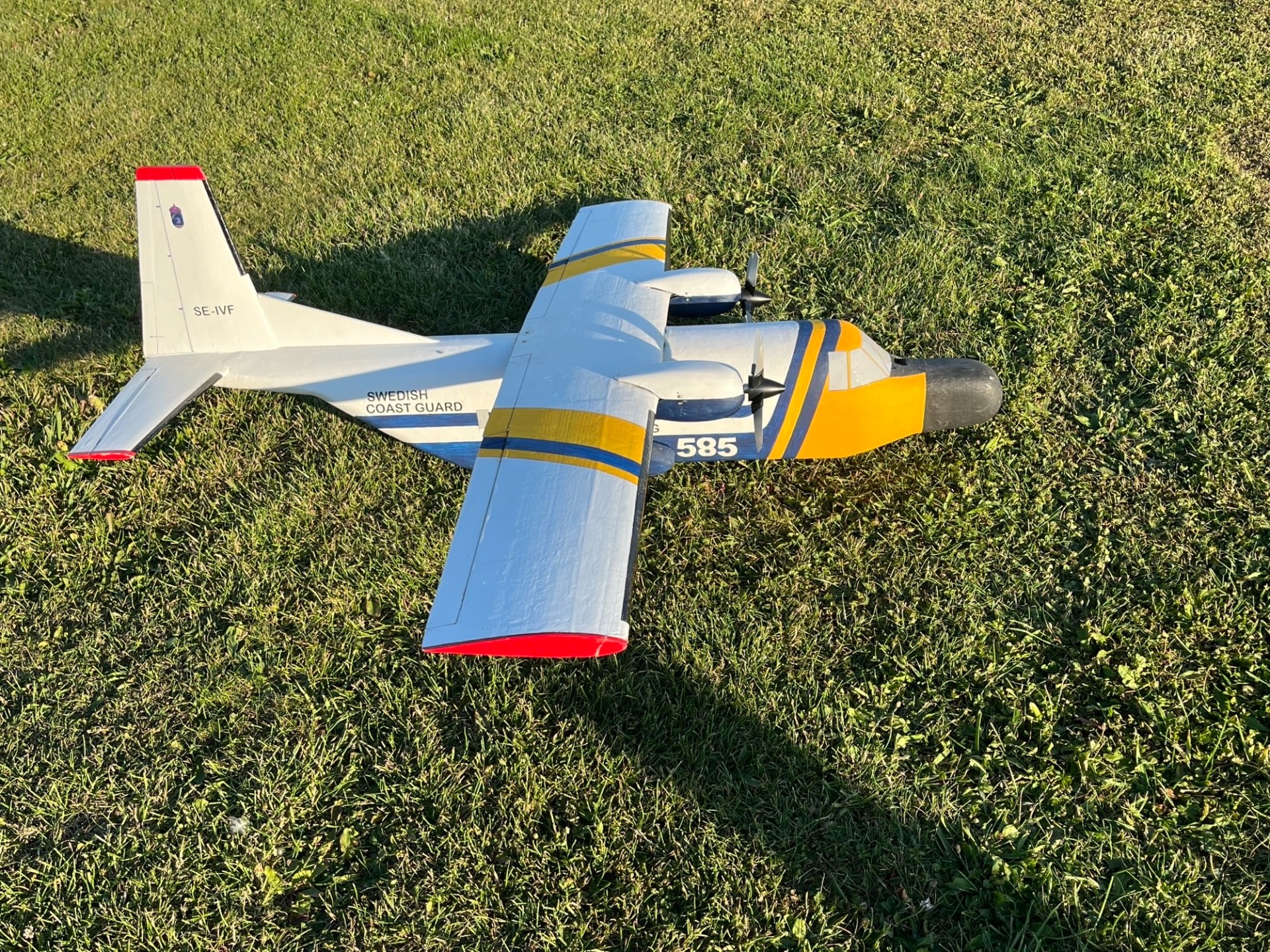 Min modell av Casa 212 har fått nya brushless motorer istället för de gamla speed 400 med växellådor som var moderna när modellen byggdes. Hela modellen är utskuren ut styrolit och klädd med papper vilket gör den lätt och stark . Det skall bli kul att se hur det fungerar med nya motorer och fyrbladiga propellrar. De gamla speed 400 motorerna hade tappat kraft men flög modellen bra när de var friska. (foto och modell, Bertil)