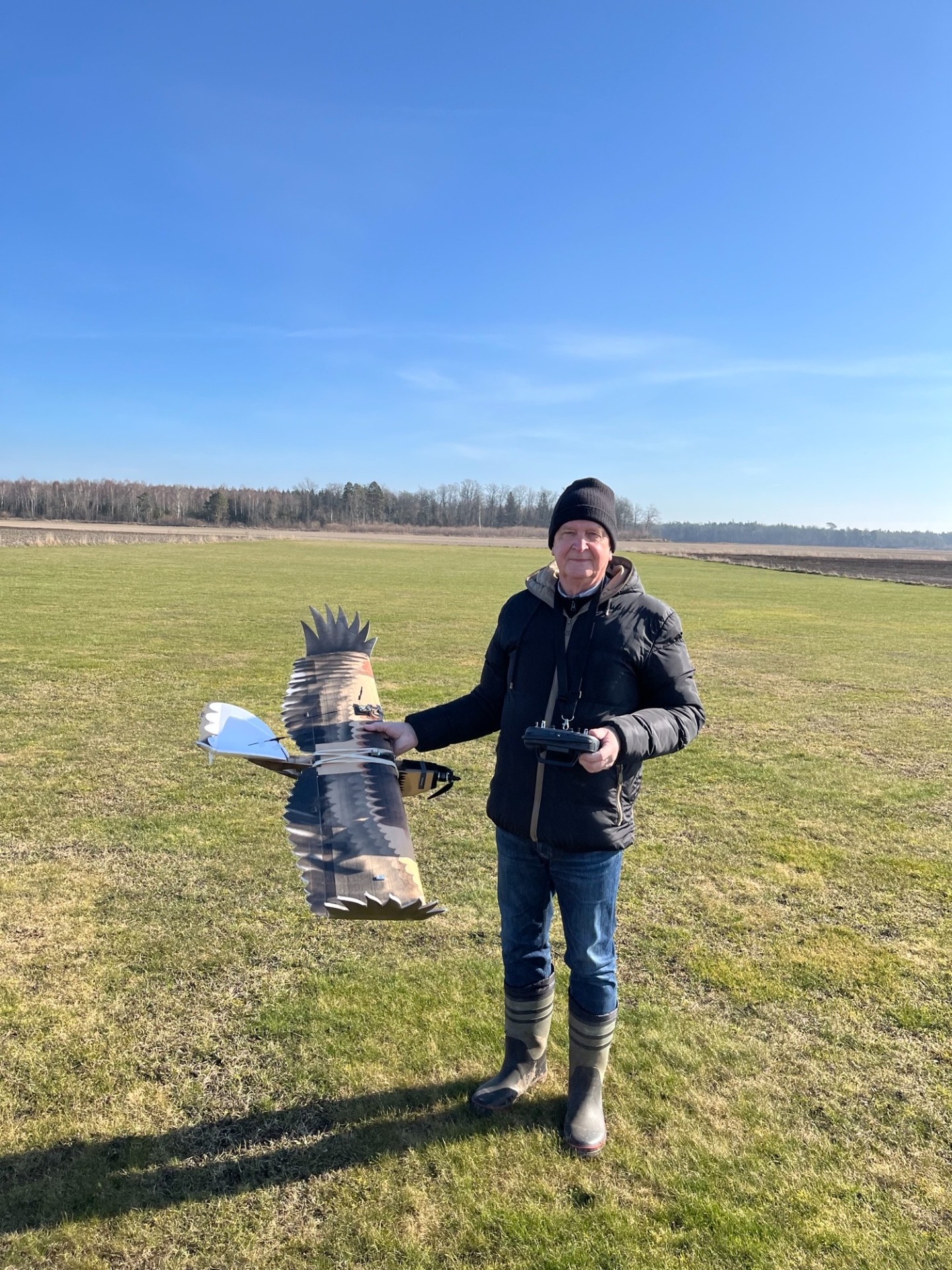Flygning med Bosses örn på fältet idag den 7 mar i strålande väder. Fältet är ovanligt torrt för årstiden. En annan örn flög förbi men var ganska långt borta och såg nog inte Bosses örn.