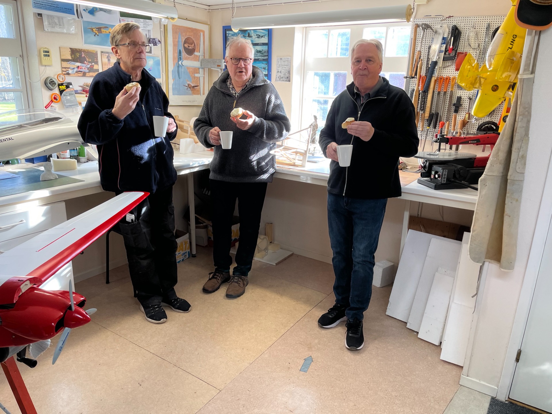 Otendagsfika med semlor i verkstaden hos Bertil. Tack för supergoda semlor Berit! Det blev några timmars trevligt modellflygsnack och Bo visade ny elektronik.