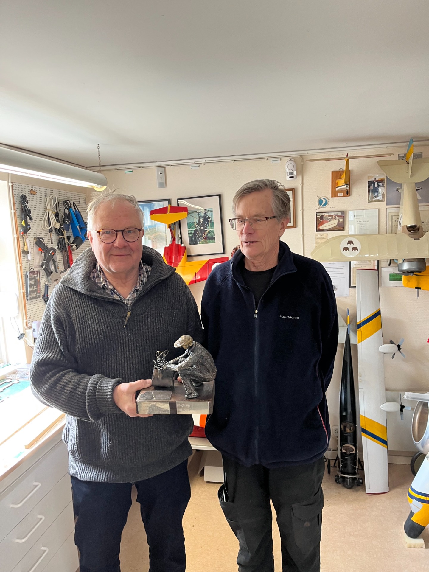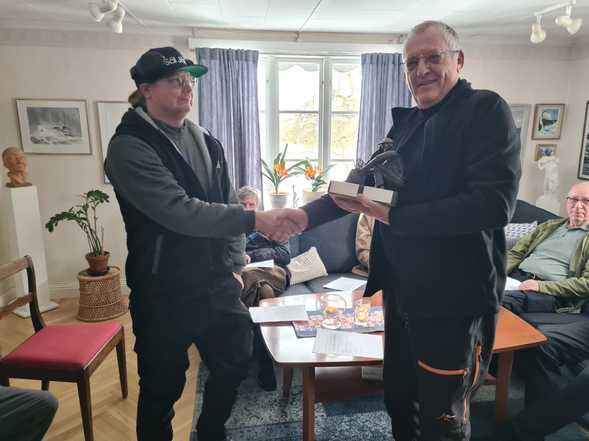 På bilden till höger får Toms Hägle Freddys vandringspris för 2024 som han tilldelades på årsmötet. Han deltog digitalt dom men nu kunde han hämta priset.