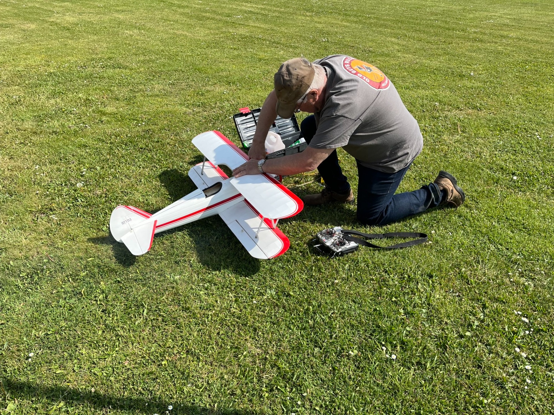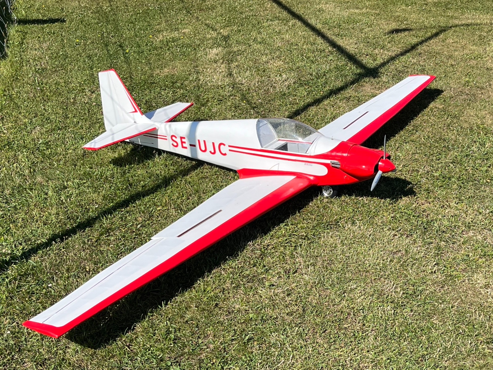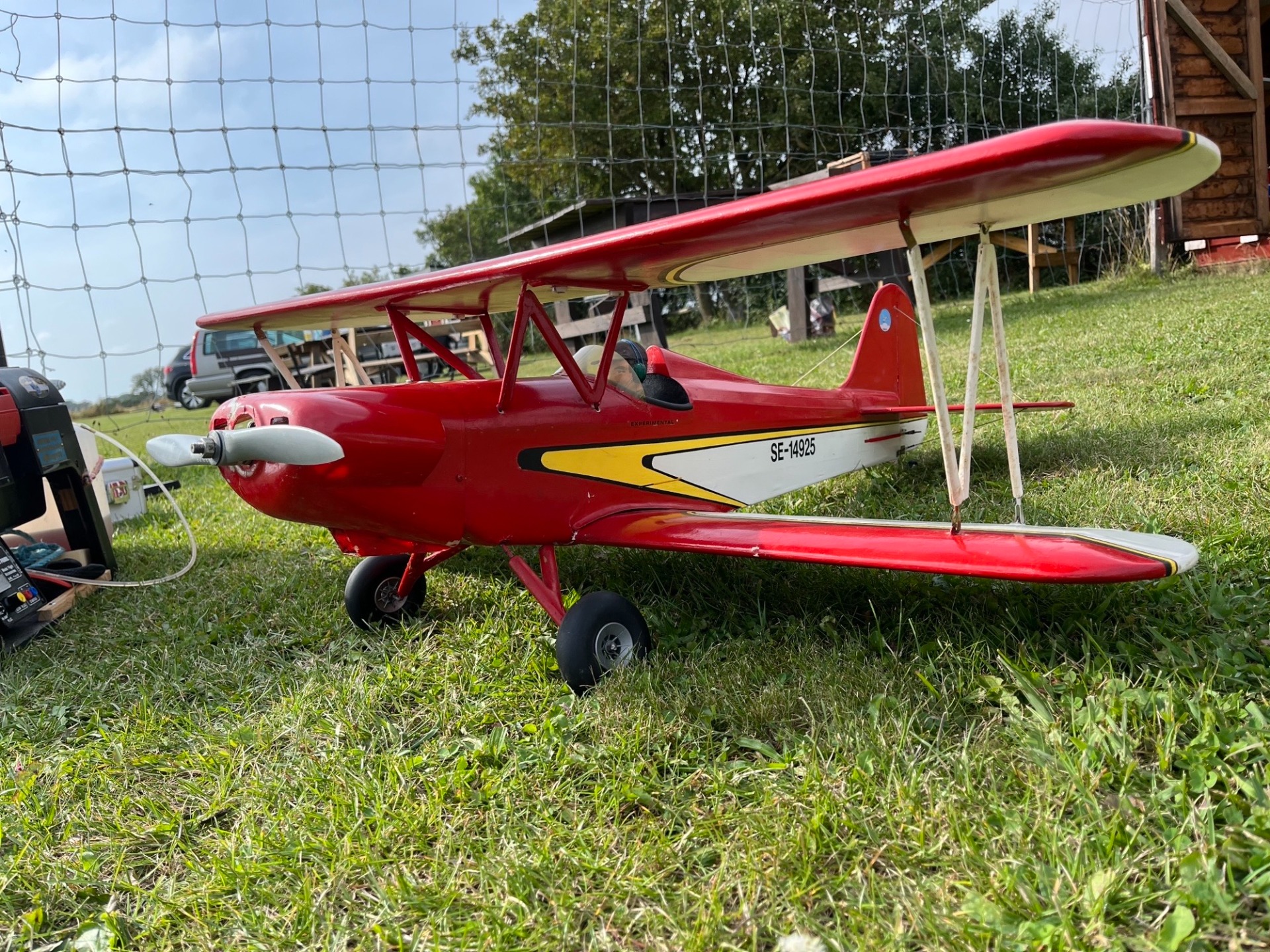 Min Fournier RF-4D i skala 1:4 på fältet strax innan provflygningen den 24 jui. Jag hade transporterat modellen på knarren färdigmonterad. Det skulle visa sig att vara ett misstag. Modellen låg på flaket så att kroppen belastade vingen vid varje litet gupp. Starten gick bra men efter en kort stund hände det som var första gången för mig. Vänster vinge brast vid kroppssidan. Allt hamnade i åkern bakom fältet. (Foto Bertil)