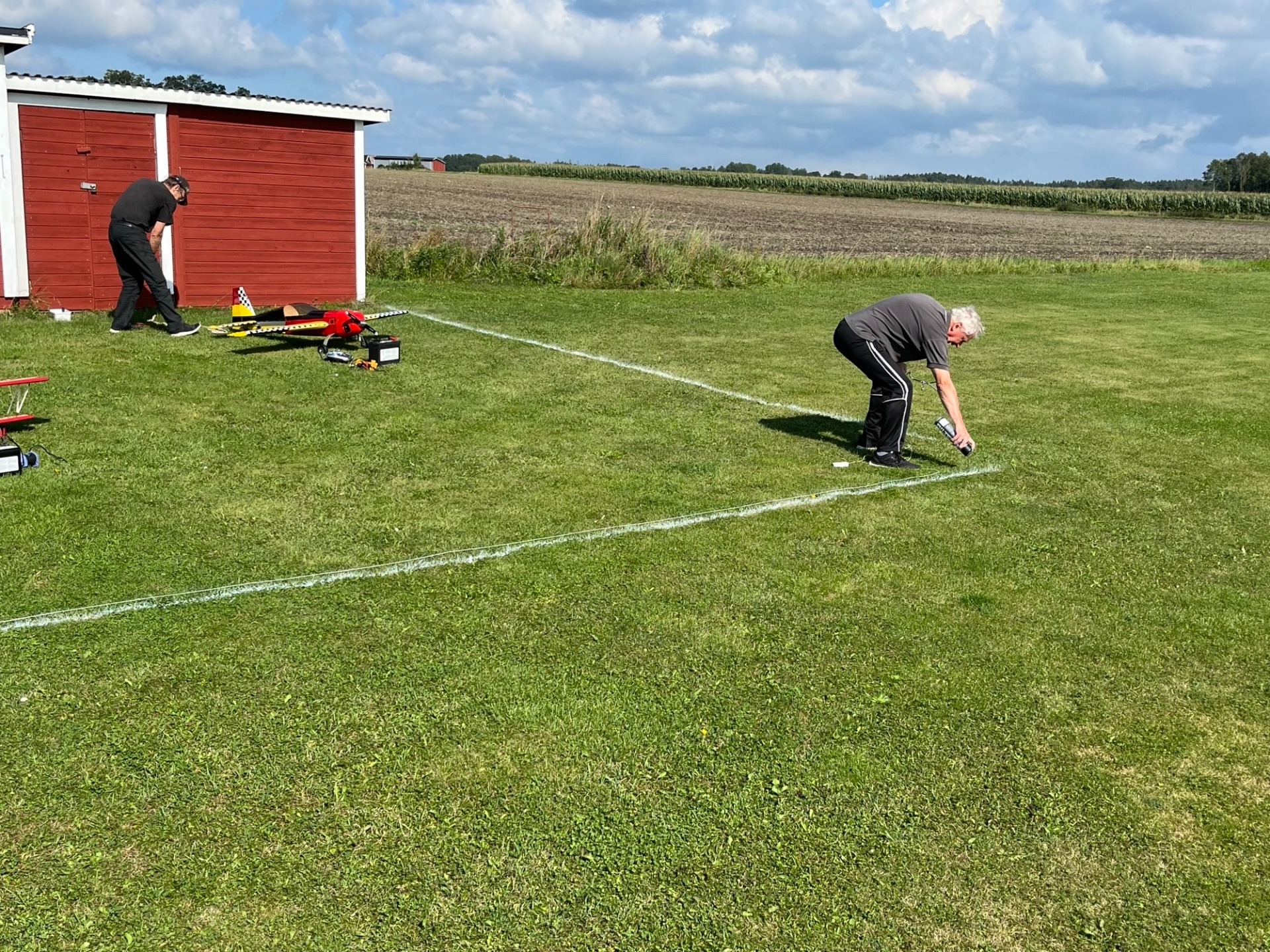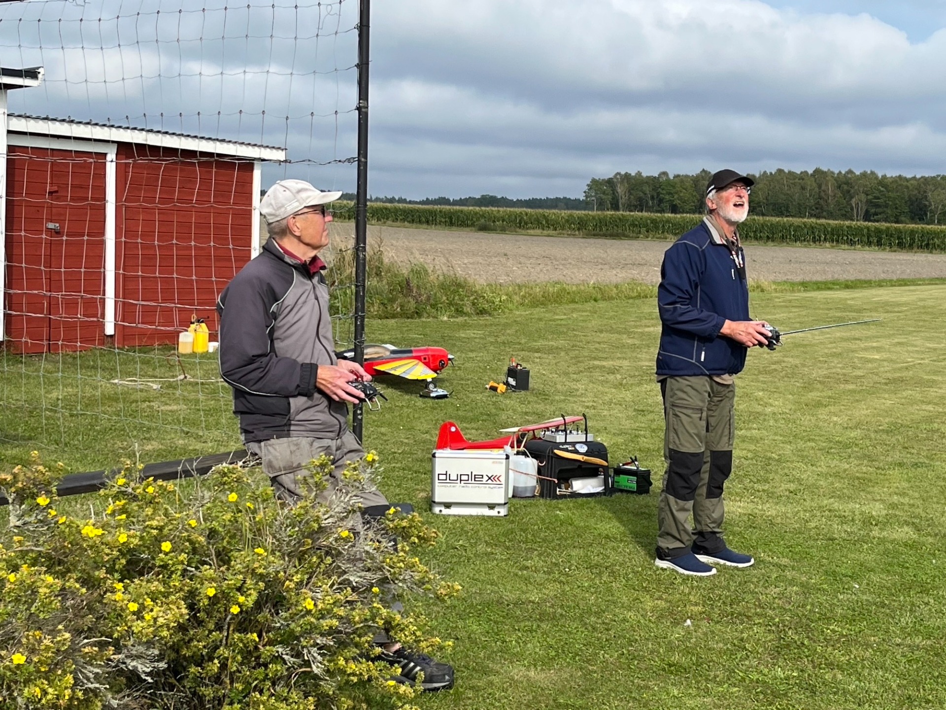 Flygning på fältet den 28 augusti på eftermiddagen. Nisse och Sten-Erik är koncentrerade på modellerna i den något byiga vinden, (Foto Bertil)