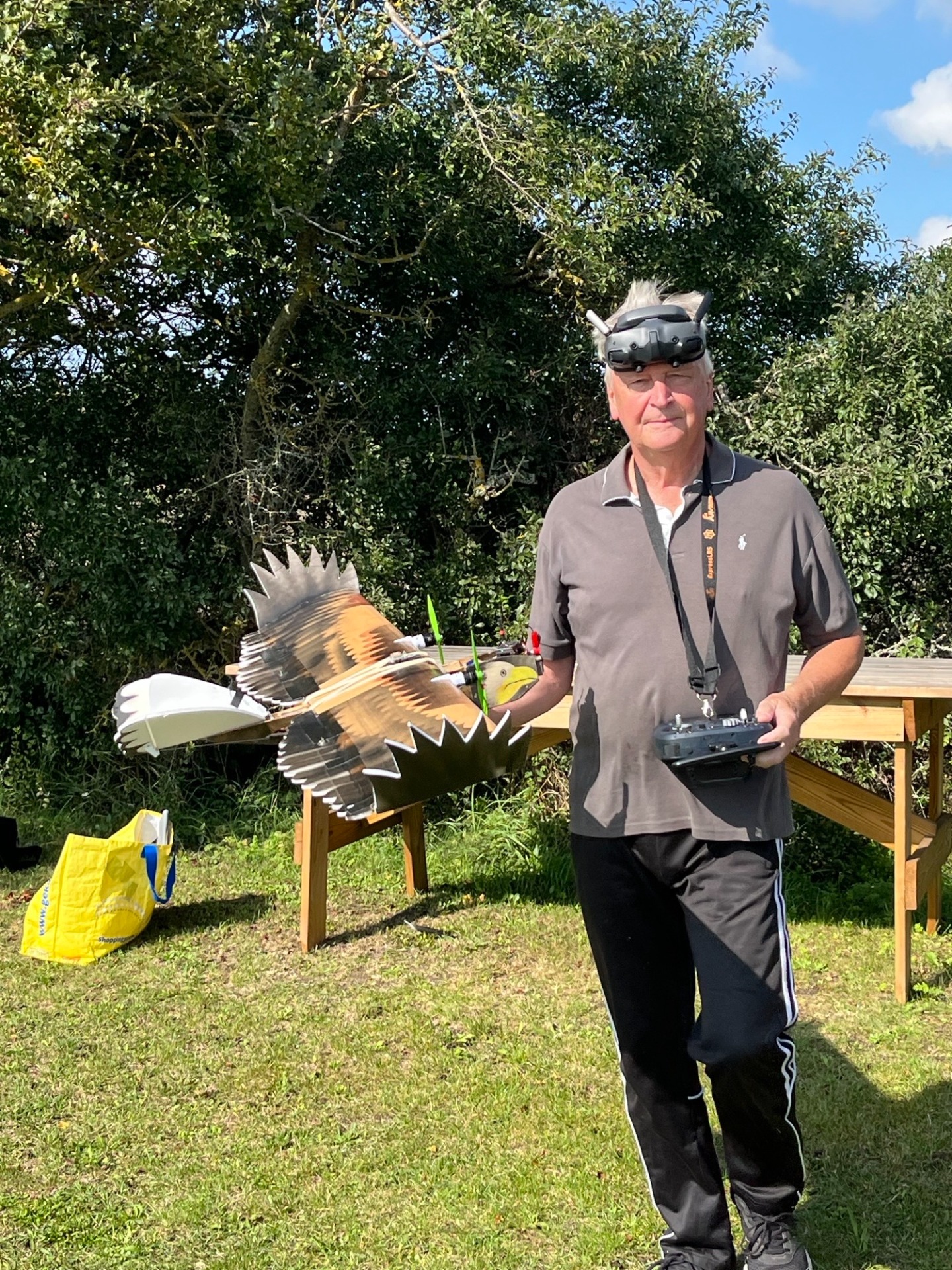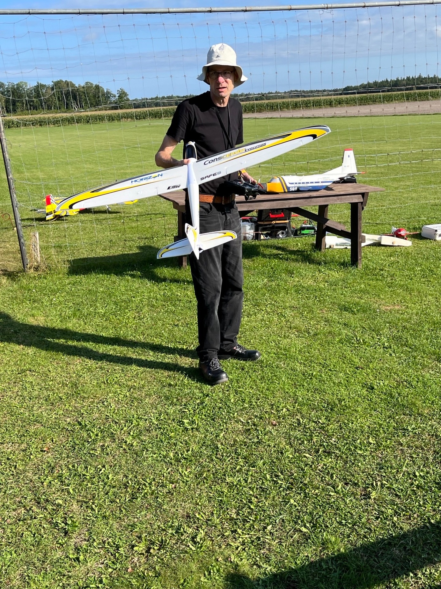 Örjan på väg att gå ut och starta för att leta termik med sin segelmodell den 7 september. (Foto Bertil)