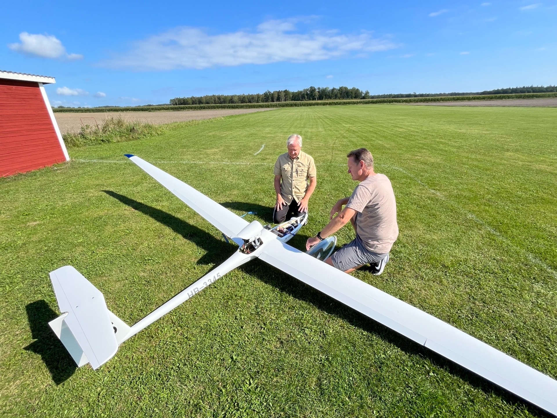 Tomas E visar Bo elektroniken i sin 6-m seglare som Tomas också provflög idag den 7 september i ett fantastiskt fint sensommarväder. (Foto Bertil)