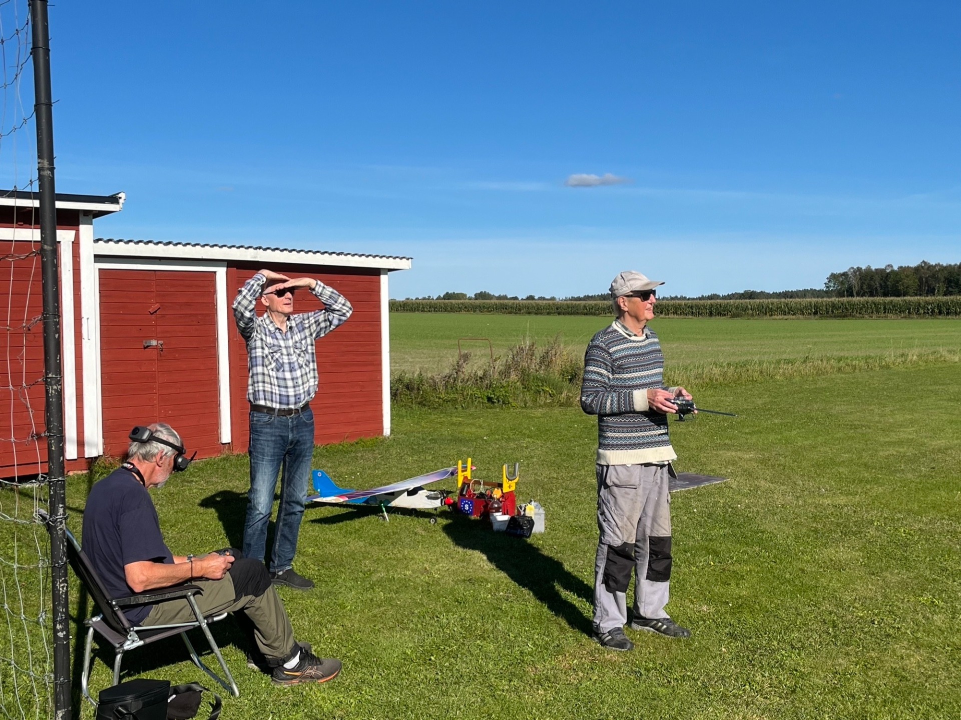 Några klubbmedlemmar som nog tittar på någon modell i luften. (Foto Bertil)