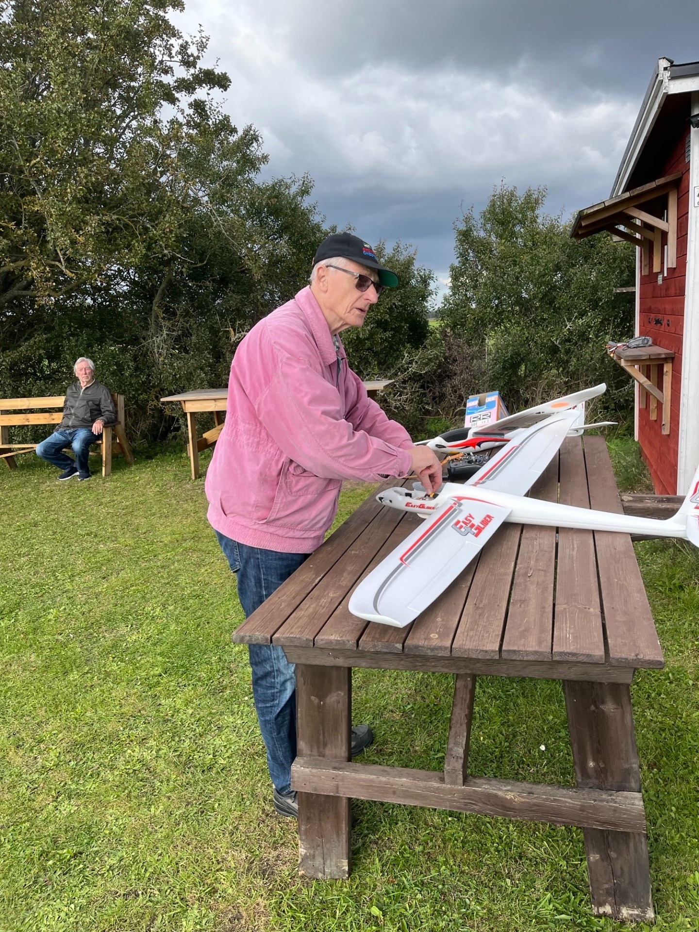 Tom monterar en ny modell för provflygning. Bertil fick äran att provflyga och det gick bra. Modellen flög lungt och fint. Tom flög därefter in sig på modellen med flera starter. Er riktig glidare och det blir säkert en bra termik jagare. Rune betraktar det hela från bänken i bakgrunden. (foto Bertil)
