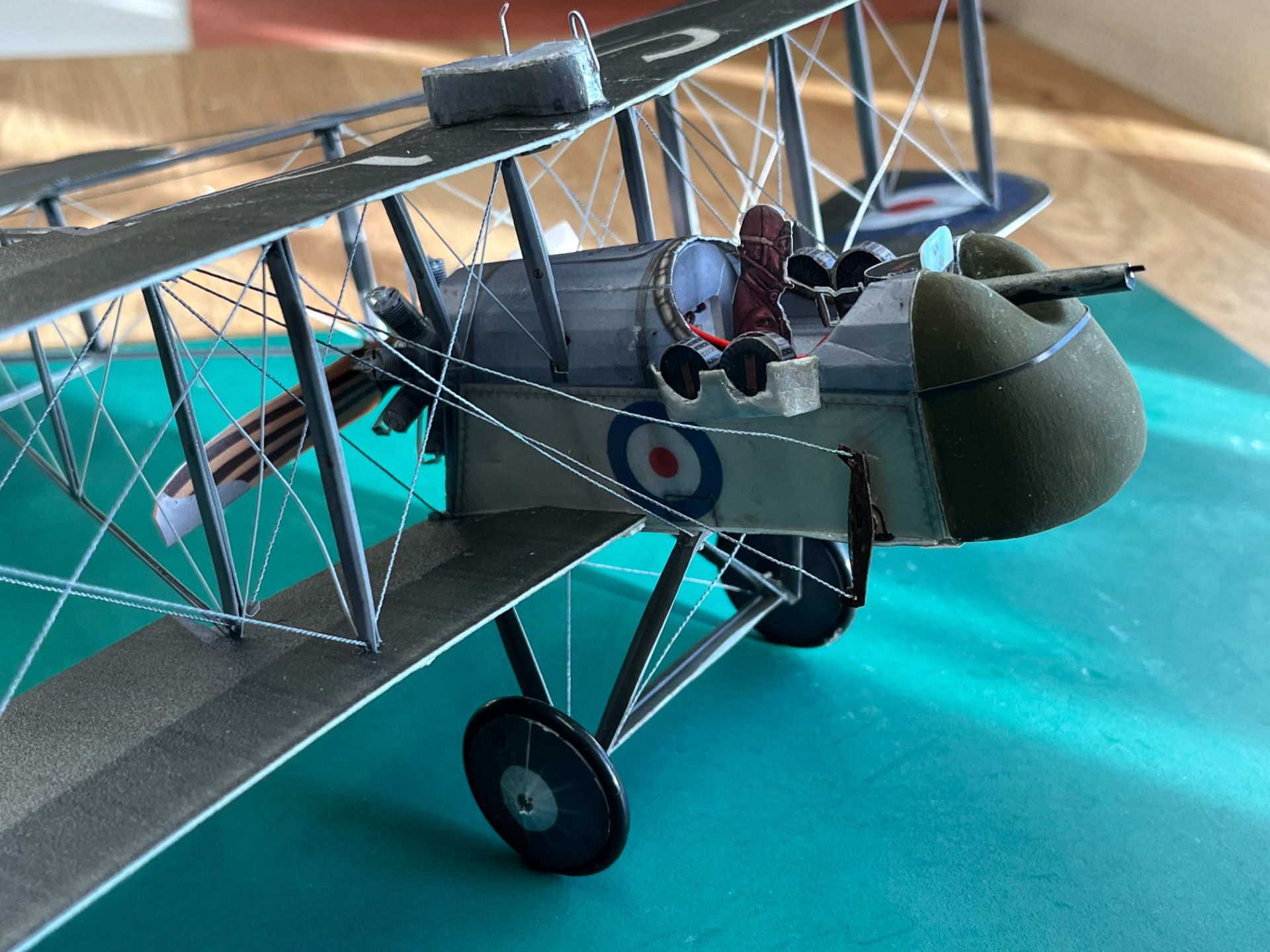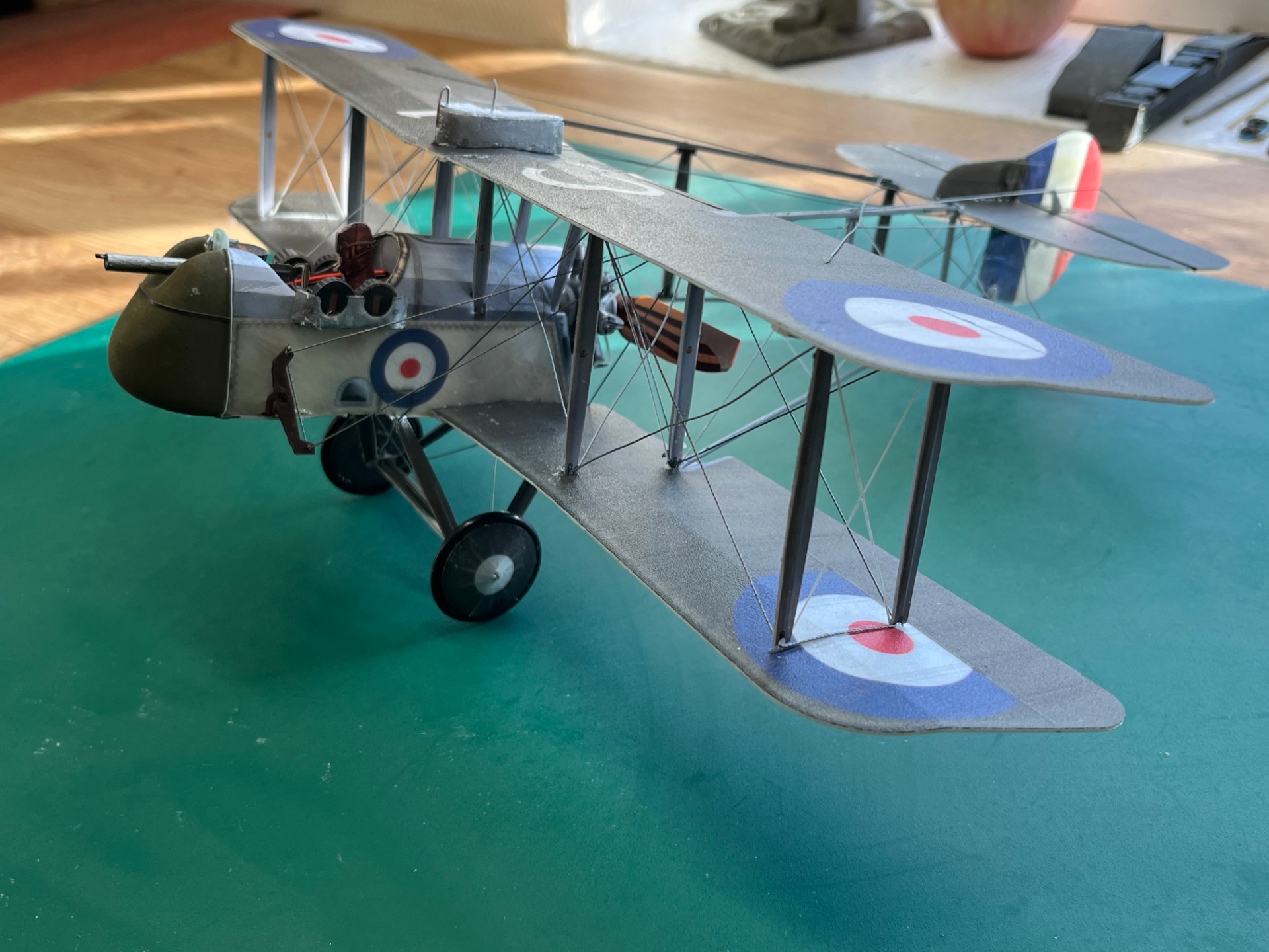 De Havilland DH-2, orignalet flögs 1917, Det är en liten skalamodell med 340 mm spännvid. Vikten är låga 40 g inklusivet allt. Mottagare , 2 servon, speedcontroller och drivacc. (Fot Bertil)