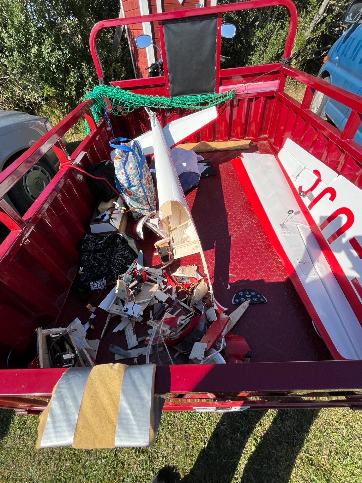 Resultatet blev som ovan...Kroppen avslagen jäms med vingens bakkant, noskåpan i atomer, elmotorn sönderslagen. Mottagaren slutade att fungera. Vingarna delvis knäckta. Mottagaren skickade jag till Jeti i Tjeckien och den kom tillbaka reparerad helt utan kostnad! Bra service! (Foto Bertil)