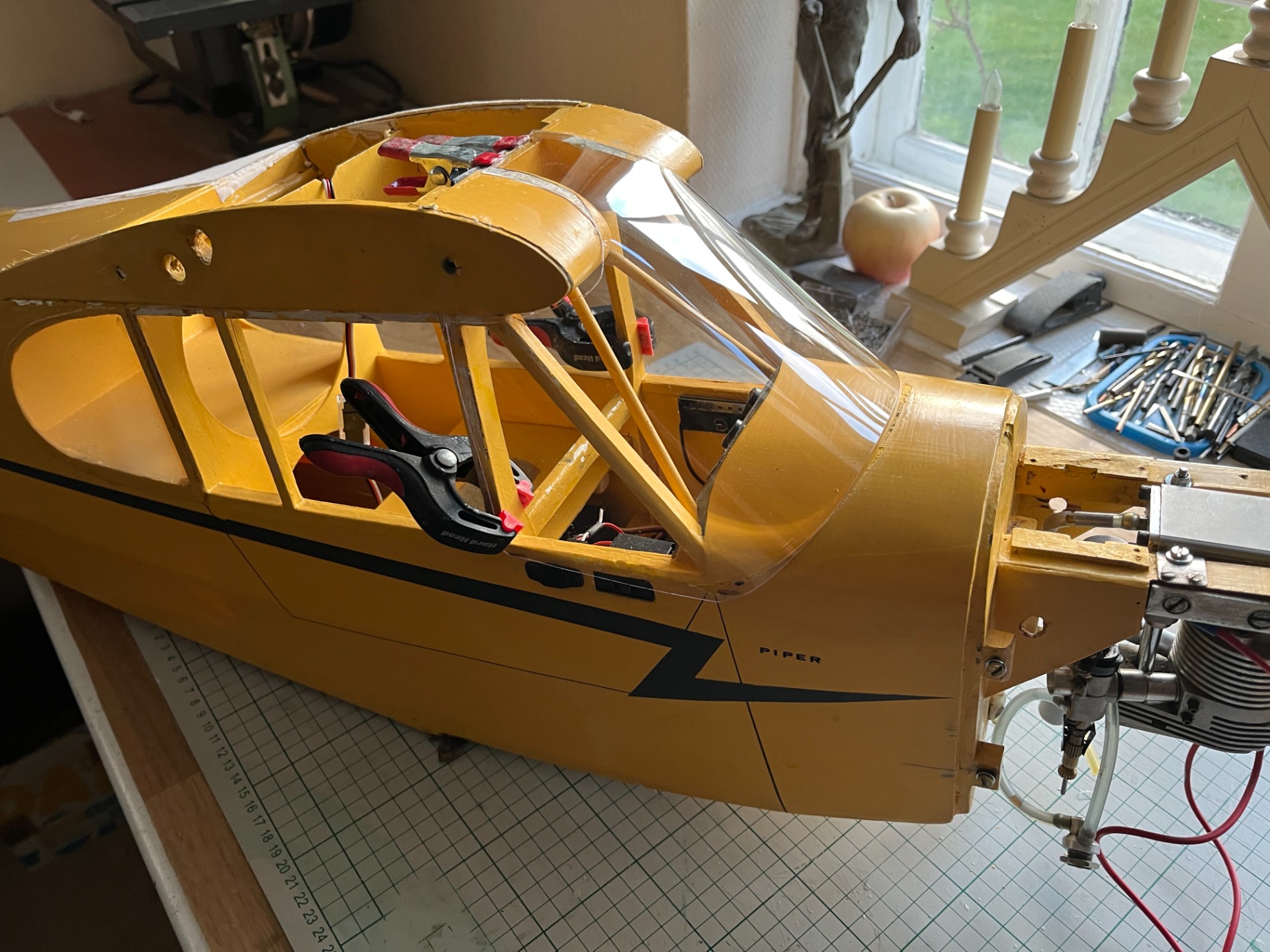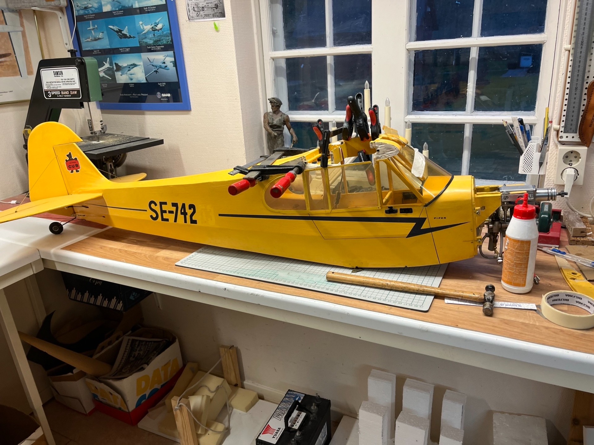 Inkommen till repverkstaden för översyn. Toms DB Models J-3 Piper Cub i skala 1:5. Vinginfästningen hade följt med vinghalvorna vid kraschen. Här har lagningen påbörjats med de gamla delarna plus lite nya bitar. (Foto Bertil)