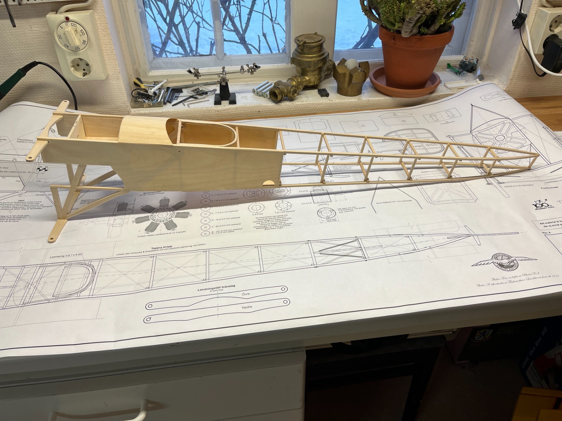 Jag har börjat att bygga på Thulin A. det är en fin byggsats från mjd designs som är i "museumskala" och komplett med motor, esc mm. Jag lovade att försöka få till modellen. Mycket att bygga och tänka igenom när det gäller metalldelar, wirestagning och fungerande wingwarpning. Motoratrappen byggs av en massa delar och skall vara roterande på en förlängd motoraxel.