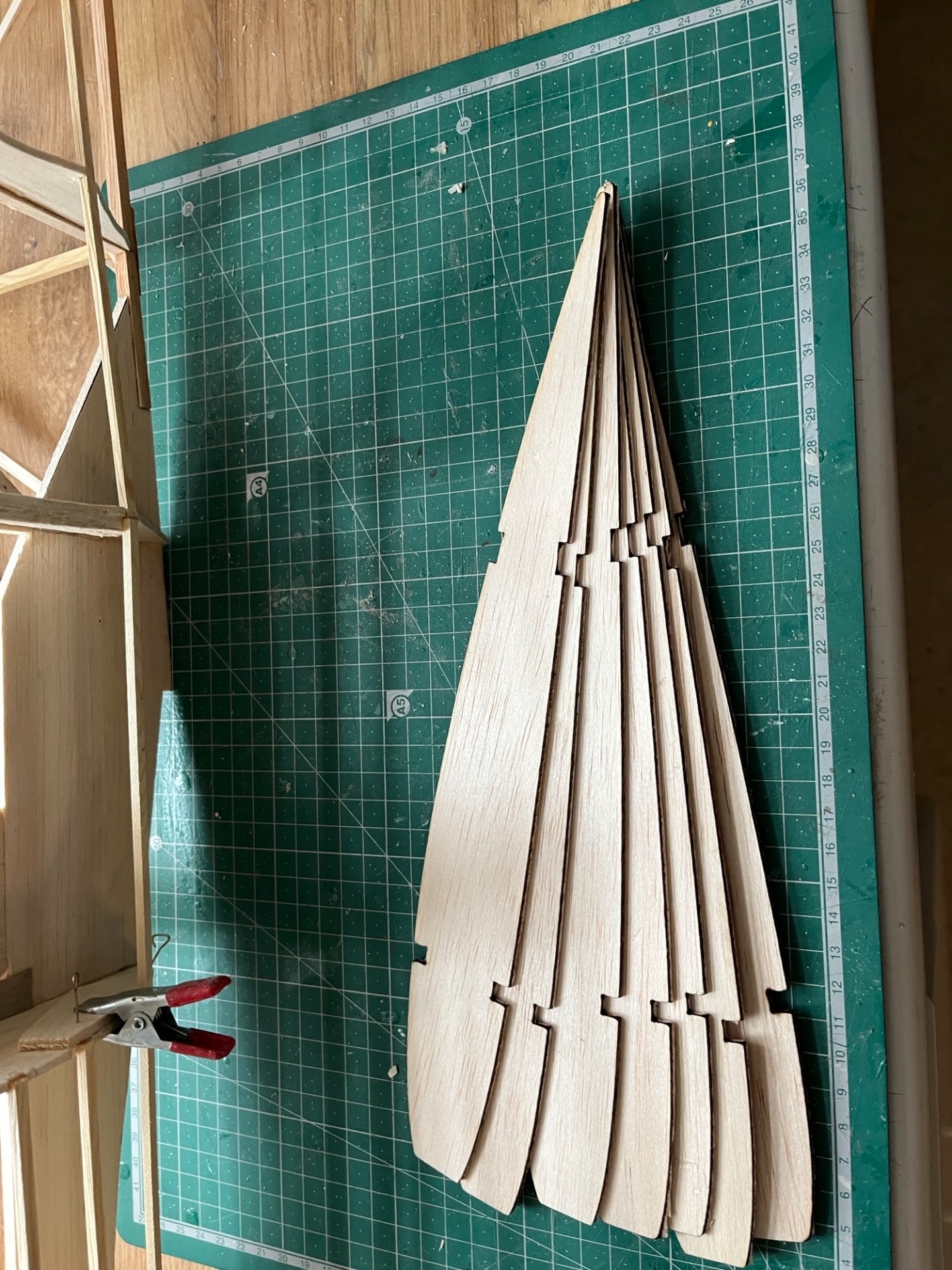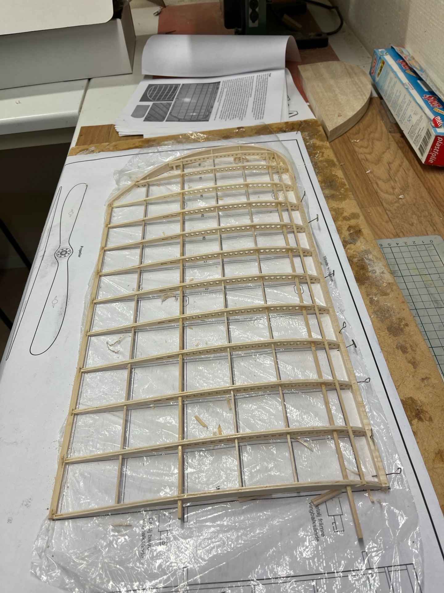 Den ena vingpanelen börjar att ta form. Det klenaste listerna är 2x2 mm och skall skjutas in i genom alla spryglar. Det gäller att vara lätt på handen och att slipa listerna till rätt passform så att listen glider in lätt men det finns inte mycket att slipa på när listen är 2x2 mm från början. (Foto Bertil 2026-01-20)