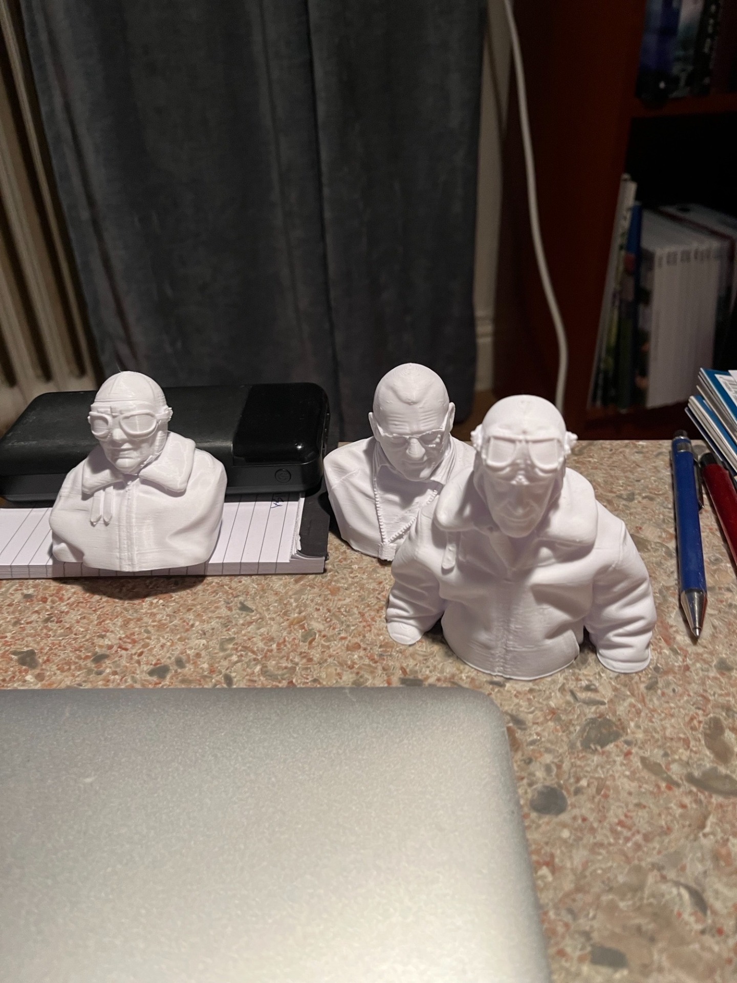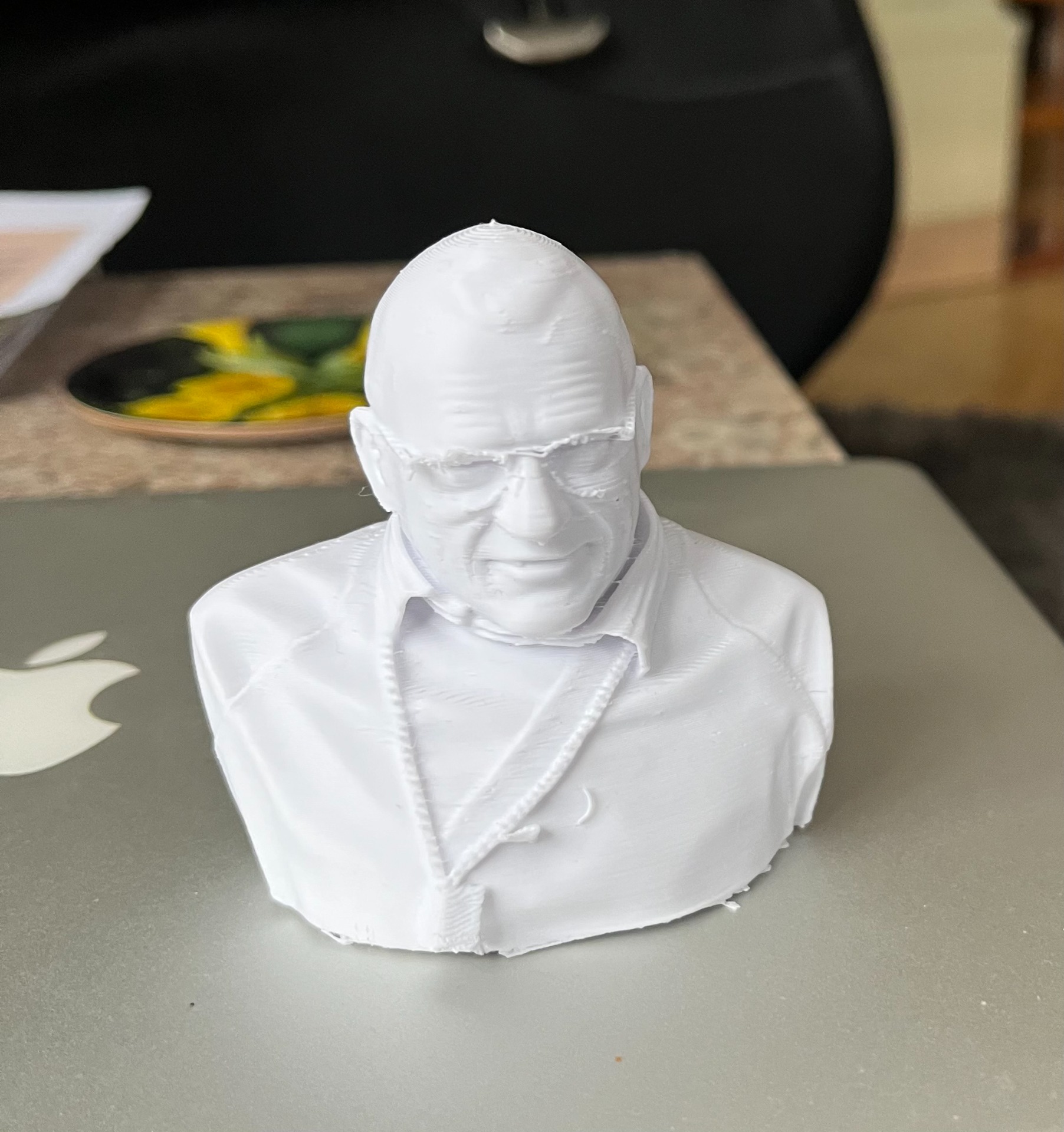 3D printad version av mig själv. Först laddar man in ett 2D foto i en programvara som omvandlar bilden till 3D. Därefter omvandlar man filen till -stl-format och därefter printar man med Simplyfy3D, Cura eller annat program. Det blir riktigt bra men mina glasögon var nog lite för tunna för att printa. För att vara första försöket blev det riktigt ok.