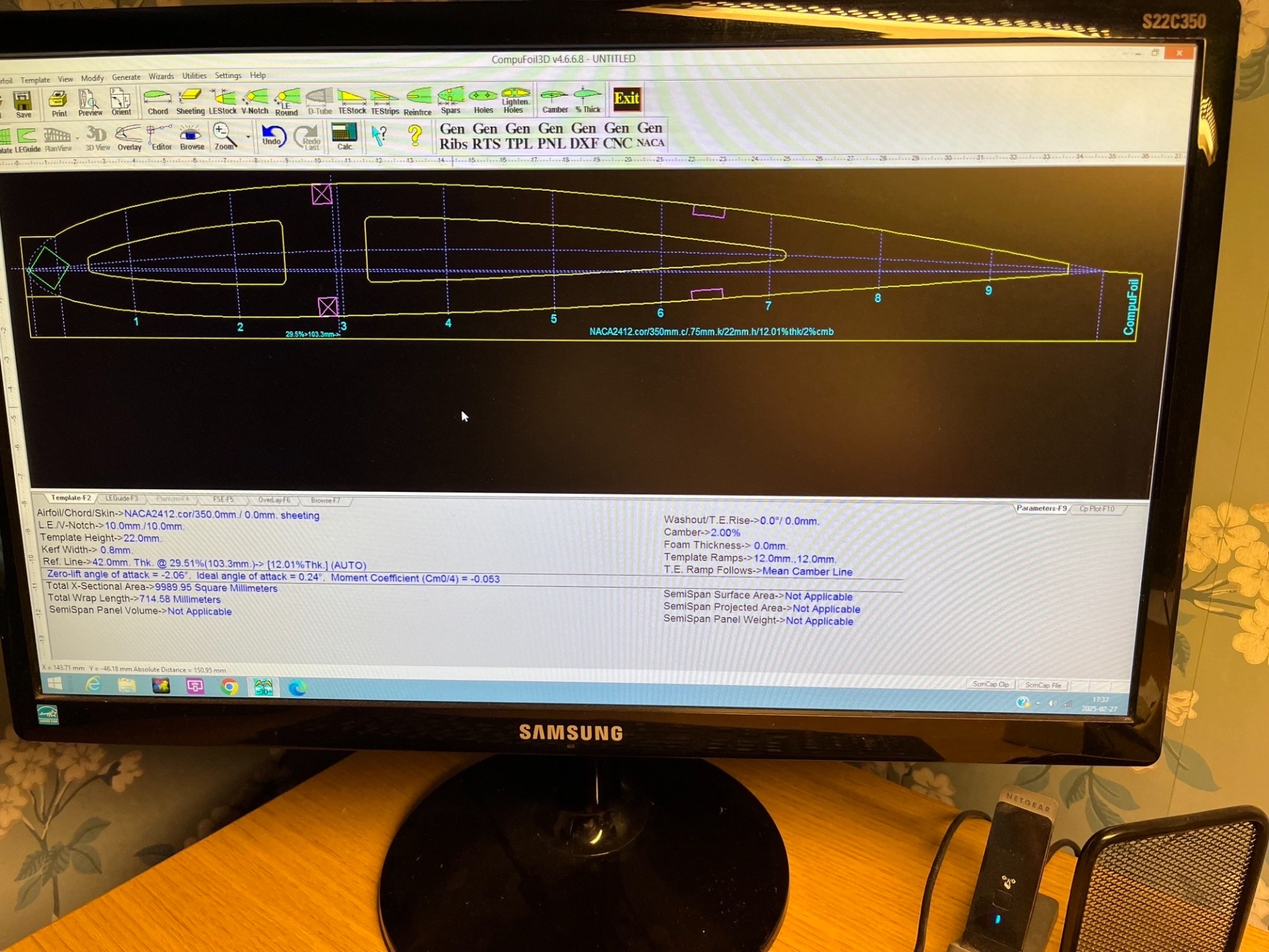 Spryglarna till min DH5 konstrueras i programmet Compufoil. Jag köpte en en licens på 80-talet och den fungerar fortfarande. Det finns ett stort urval av sprygelprofiler som går att modifiera om man så vill. Jag använder profilen NACA 2412 precis så som jag har det på min modell i skala 1:5. Ingen idé att ändra ett fungerande koncept. (Foto Bertil 2026-02-28)