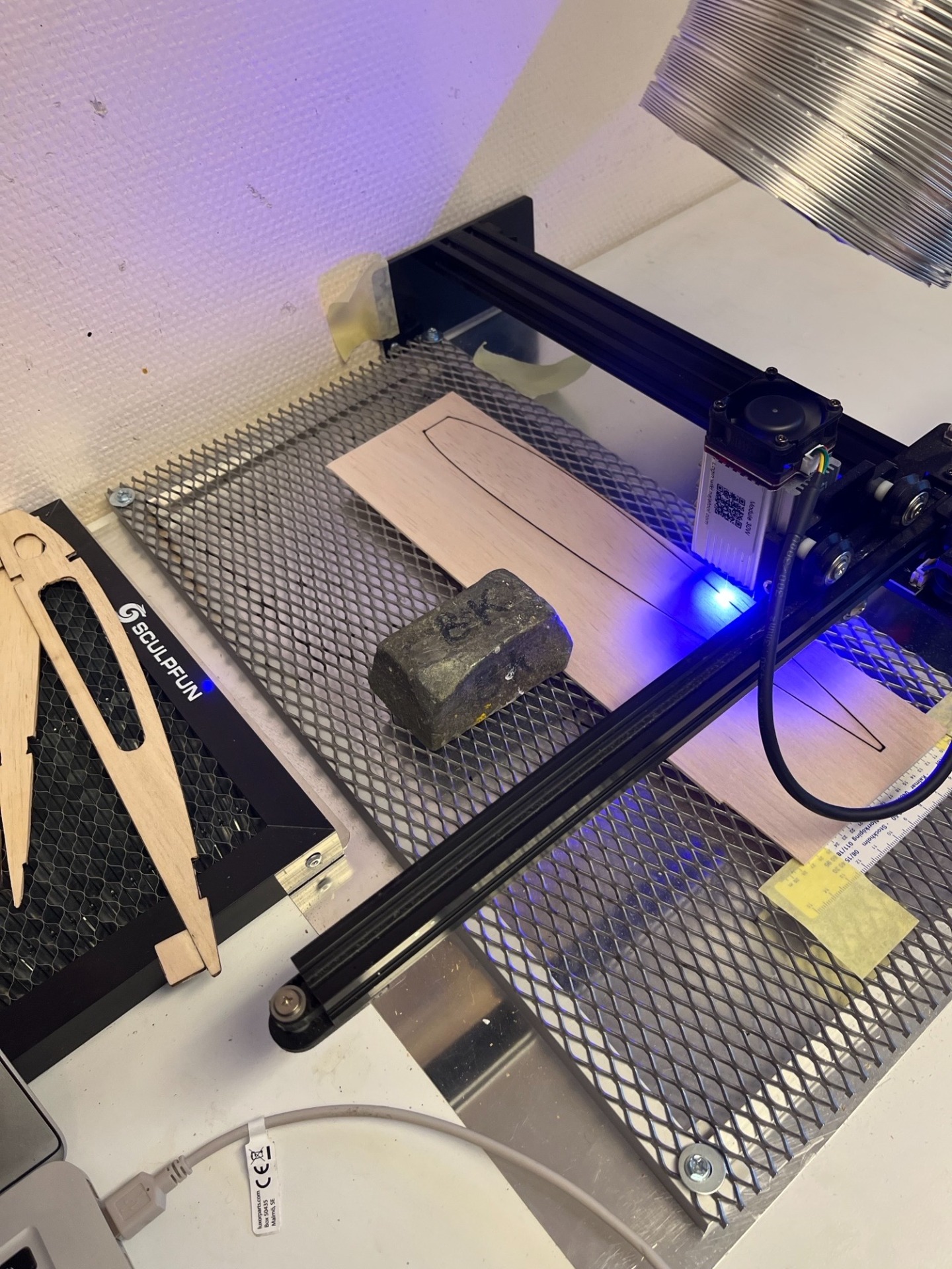 När sprygelfilen konverterats till dxf- format kan den exporteras till programmet Lightburn. Där konverteras filen till Lightburns filformat för skärning med laser. Lightburn är ett helt CAD-programm i sig självt och det finns många möjligheter och inställningar. Jag använder de vanligaste parametrarna för laserskärning. På bilden skärs en sprygel ut ur 2,5 mm medelhård balsa. (Foto Bertil)