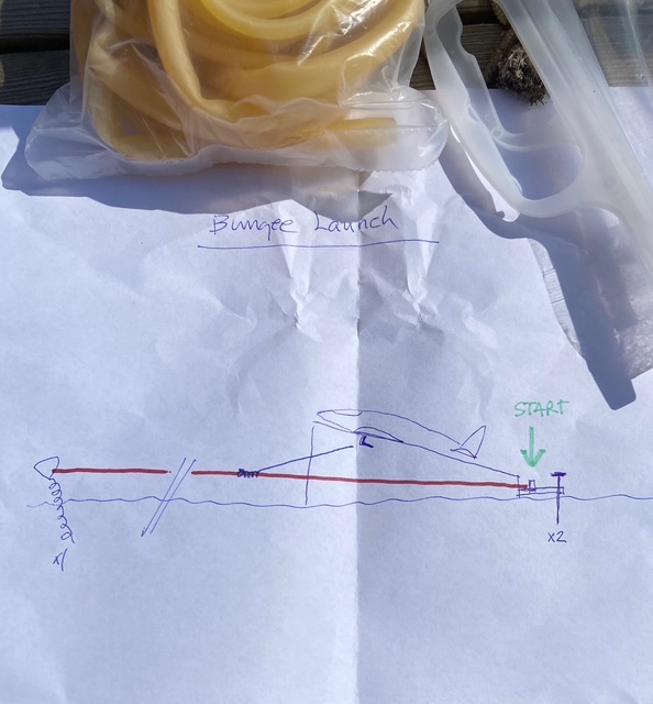 Jag ( Bertil K) har haft en anordning för bungee- start i flera år i hangaren. Nu har Bosse tagit tag i den och den finns nu på fältet att använda för de medlemmar som vill. På skissen ovan ser du hur den är tänkt att fungera. Gummirep och jordspikar finns att använda. (Foto Bo Lagerström)